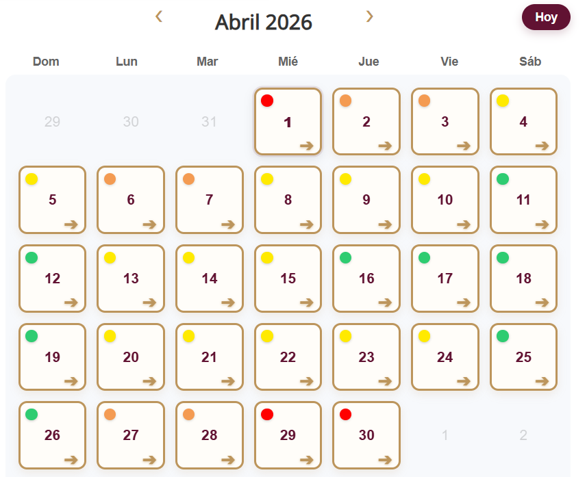 Adjuntamos el Calendario de Disponibilidad y Saturación previsto para este mes de abril. Como podrán observar en el gráfico, los primeros y últimos días del mes suelen presentar un estatus de alta demanda (puntos rojos), lo cual puede derivar en intermitencias en el sistema o tiempos de espera prolongados.